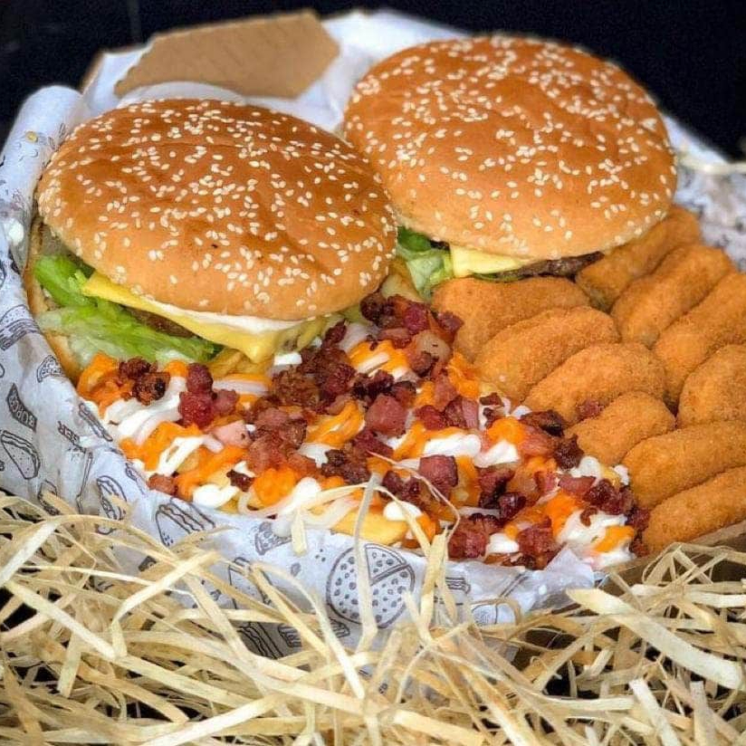 2 Smash Bacon + 1/2 porção de fritas completa ( Catupiry, Cheddar Cremoso, Billy Jack, Maionese temperada e Bacon) 10 Nuggets