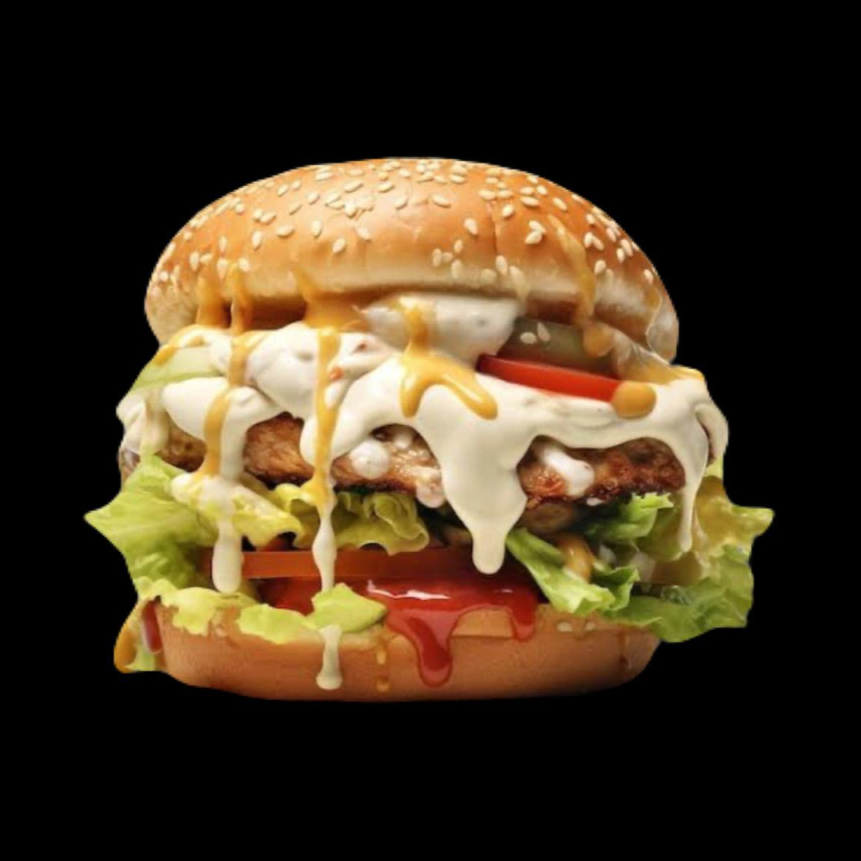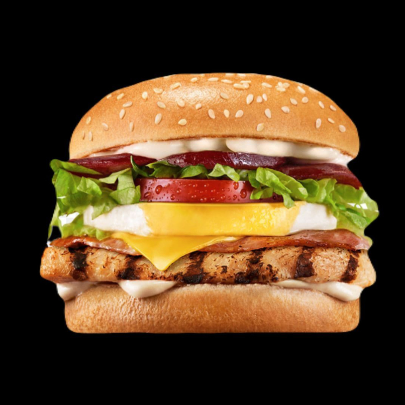 Pão de brioche, filé de frango grelhado, Creem Chease Catupiry, bacon fatiado, queijo prato, alface, tomate, maionese temperada, Billy Jack e barbecue