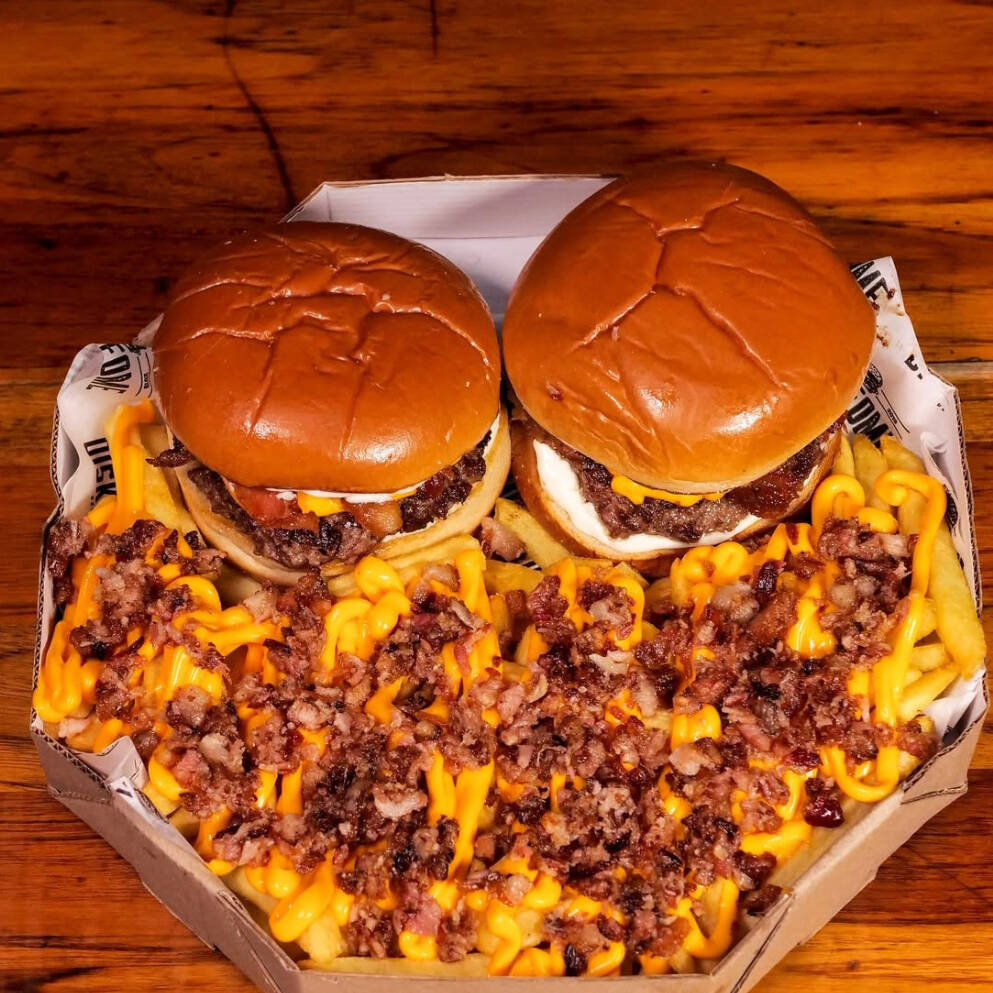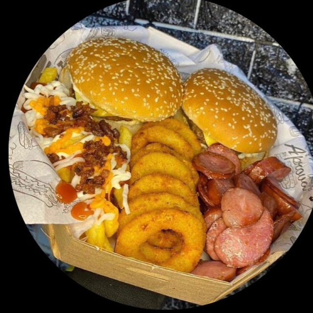 2 Deliciosos Burguer no pão de gergelim, a escolher( Bruttus tudo, Duplo Requeijão, Triplo Cheddar ou Big Bruttus), acompanhado da batata , coberta com Requeijão, cheddar, Bacon, maioneses da casa, Billy jack, Calabresa, oregano e alho torrado na Caixa de 25cm
