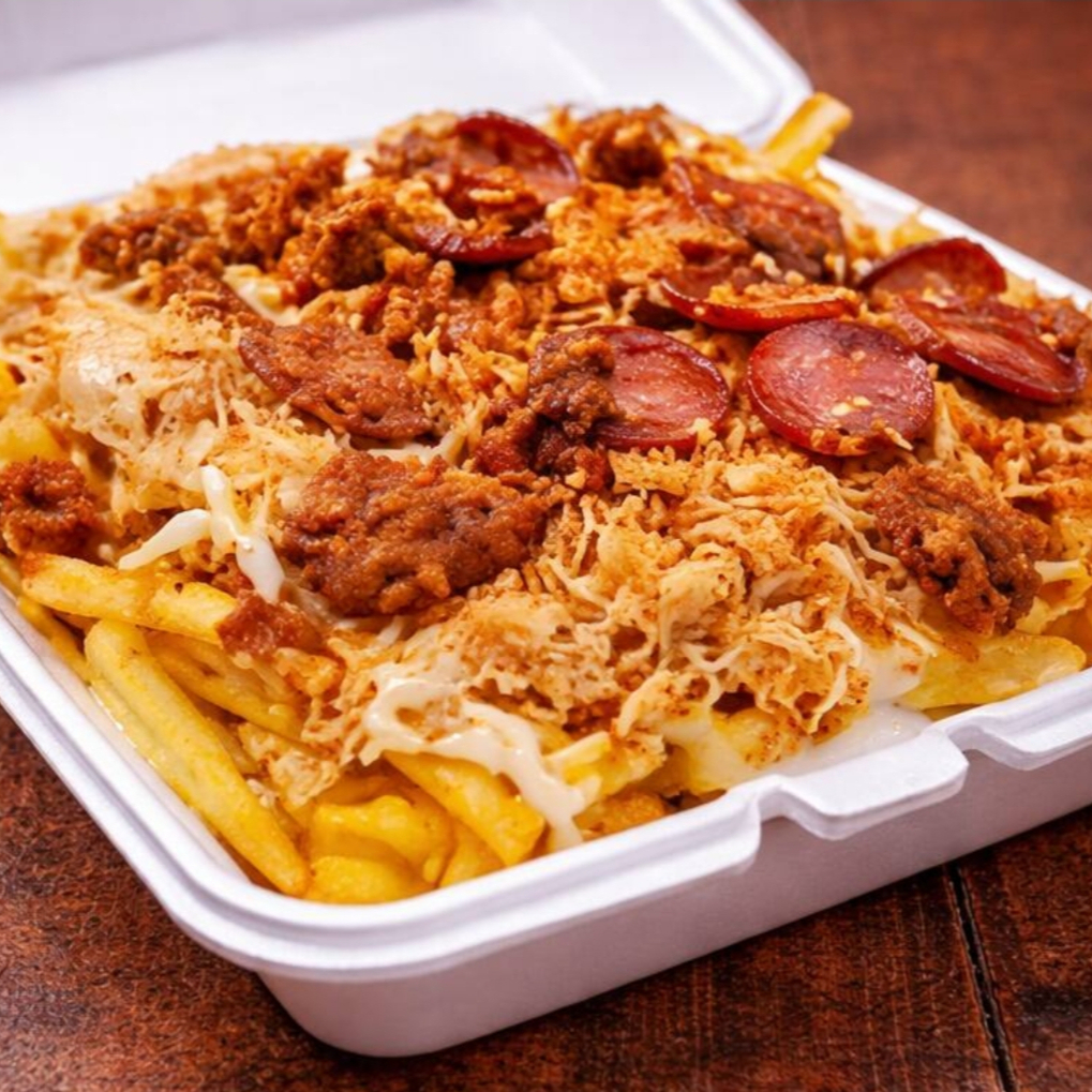 Cheedar cremoso + Catupiry + bacon granulado + molho verde + Molho Billy jack + alho torrado + orégano