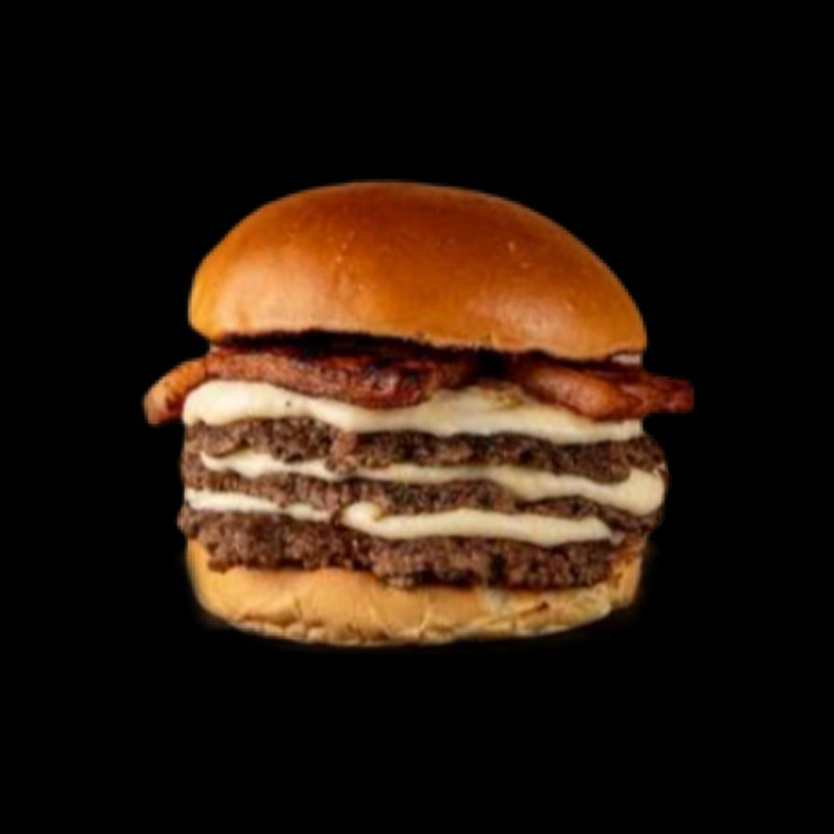 3 Carnes + Bacon + Queijo Prato Triplo + Cheddar Cremoso + Alface + Tomate + Picles + Molho Billy Jack + Molho Verde + Molho Barbecue