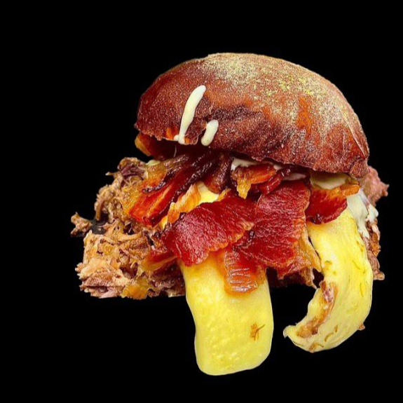2 carnes de 150g de Pernil+ farofa de bacon + cebola caramelizada + queijo prato + Queijo Mussarela Derretido + Requeijão + molho Grill