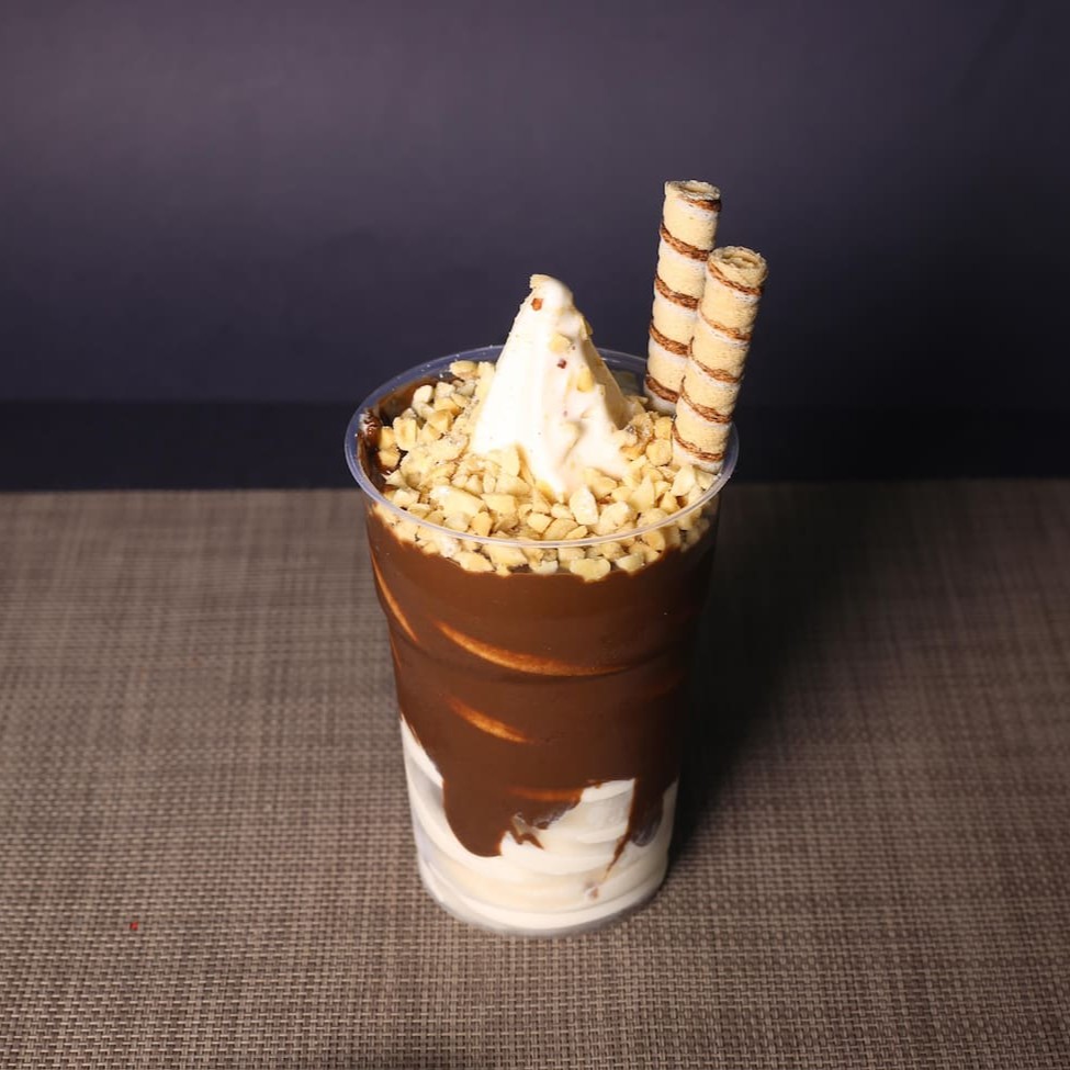 Delicioso sorvete cremoso de baunilha, regado com calda de Nutella, finalizado com farofa crocante de amendoim