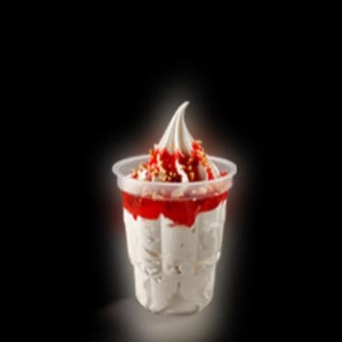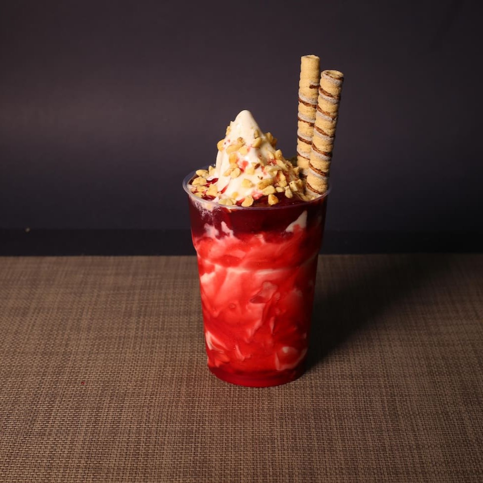 Delicioso sorvete cremoso de baunilha, regado com calda de morango com pedaços, finalizado com farofa crocante de amendoim