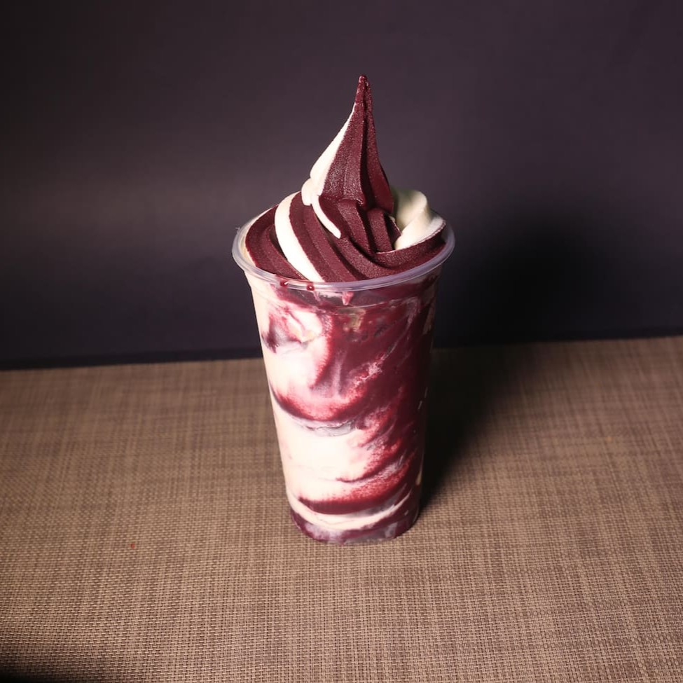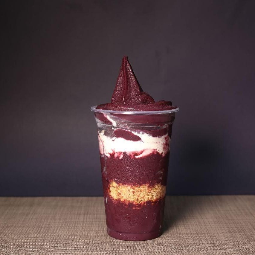 Copo de baunilha e Açai que combina a intensidade e cremosidade do açaí com a suavidade e doçura do sorvete de baunilha.