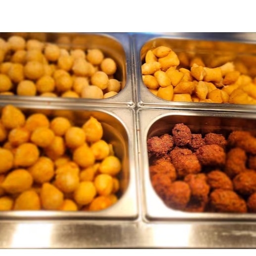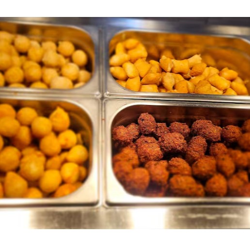 Coxinha, carne, risole de camarão, calabresa com queijo, queijo com presunto,quibe e queijo com alho.