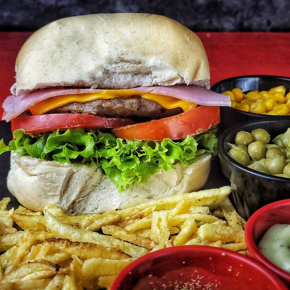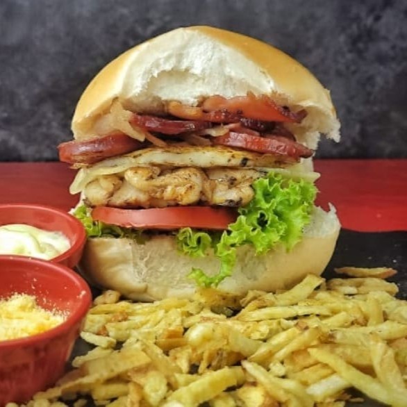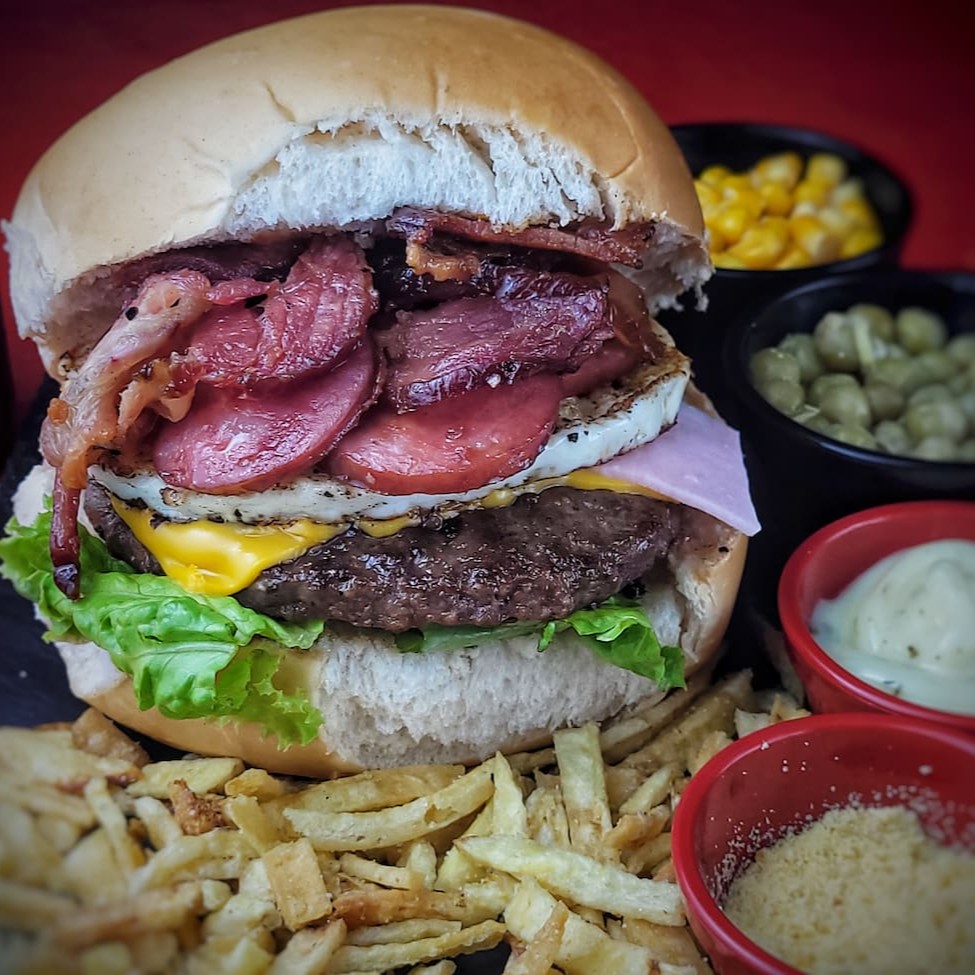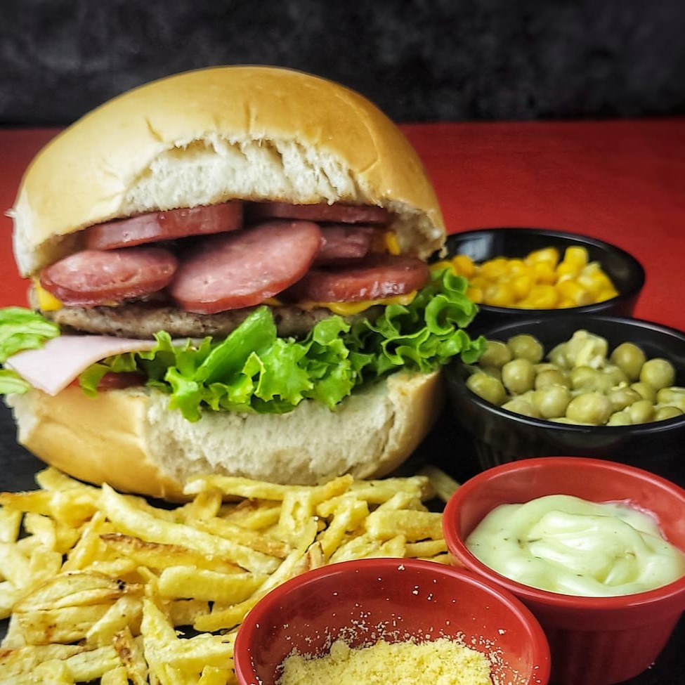 O 'Big Russo' é um fabuloso hambúrguer composto por duas suculentas carnes, tenro pão bola, rico queijo cheddar, fatias de presunto de alta qualidade, um ovo perfeitamente cozido, crocante bacon, saborosa calabresa, ketchup, nosso exclusivo molho especial da casa, milho fresco, ervilhas verdes, batata palha crocante, refrescante alface e tomate fatiado, finalizado com queijo ralado por cima. Uma verdadeira explosão de sabores que fará seu paladar viajar!