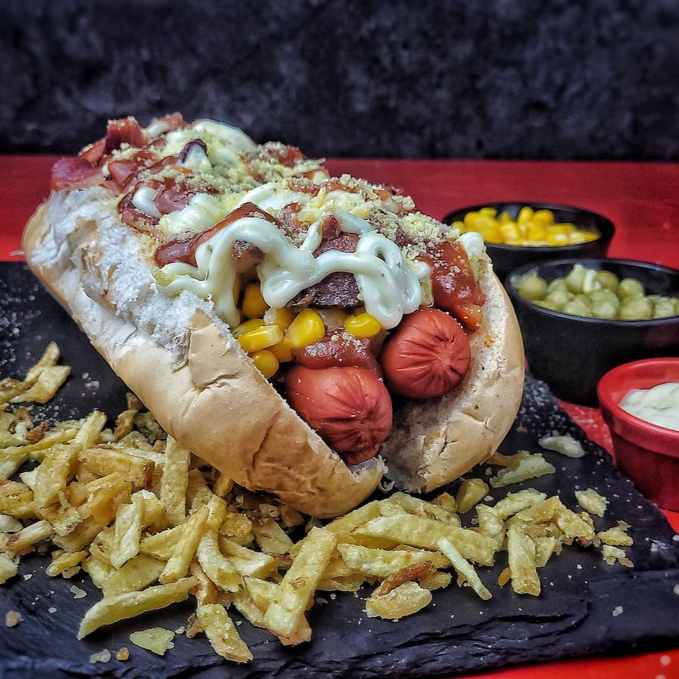 Delicie-se com nosso Cachorro Quente Duplo, um prato recheado com duas suculentas salsichas ou linguiças, generosamente cobertas com um molho caseiro de tomate, cebola e pimentão. A cada mordida, surpreenda-se com o toque sutil do ovo de codorna, aliado à maionese especial que acrescenta um sabor irresistível. O ketchup, milho e ervilha trazem um sabor agridoce ao prato, enquanto a batata palha proporciona uma textura crocante. Para finalizar, uma generosa porção de queijo ralado derretido, que torna essa experiência culinária inesquecível.