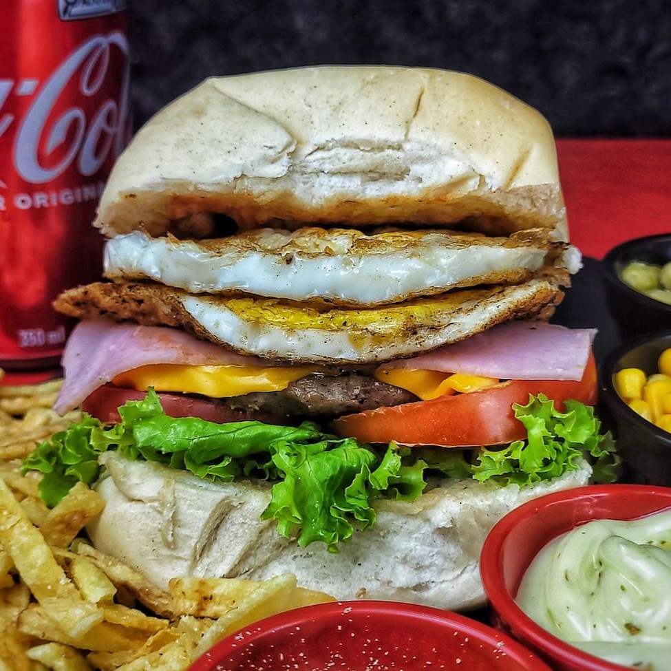 Pão bola, carne, queijo, cheddar, presunto, ovo, bacon, calabresa, ketchup, molho especial da casa, milho, ervilha, batata palha, salada(alface e tomate) e queijo ralado. + 1 Coca 2 litros Obs: Todos os lanches são montados e preparados de forma iguais .