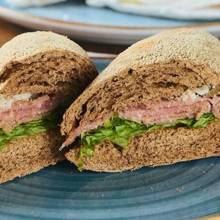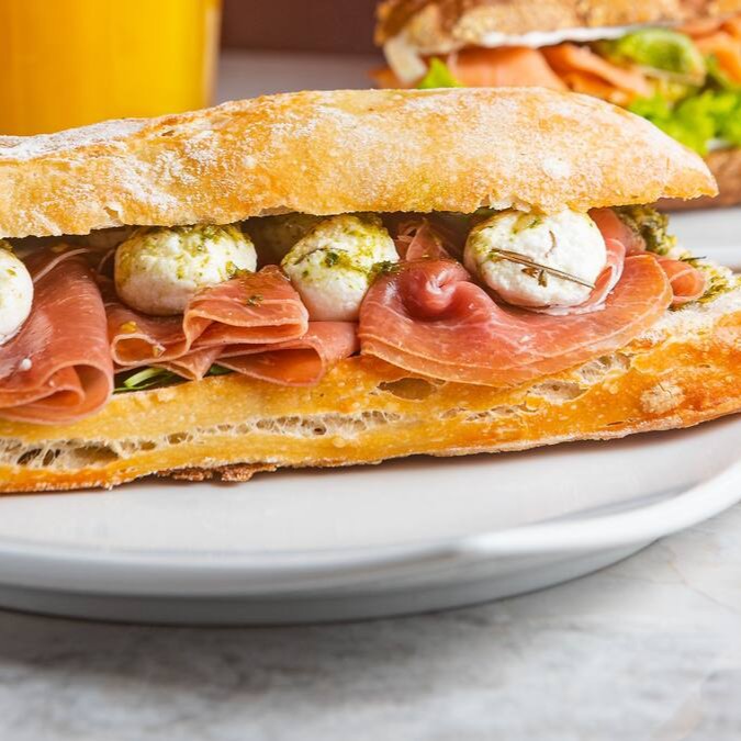 Delicie-se com o nosso Sanduíche Parma, uma verdadeira jóia gastronômica na categoria Sanduíches. Este prato é generosamente recheado com o autêntico presunto de Parma, de textura delicada e sabor inconfundível. Acompanha o suave e sofisticado queijo de cabra, que equilibra de forma sublime cada mordida. O toque final fica por conta do nosso molho pesto caseiro, fresco e cheio de sabor, e da rúcula, que adiciona uma pitada de amargor e frescor. Uma combinação irresistível e rica em sabores para o seu paladar!