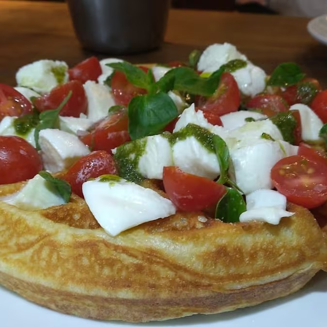 Apresentamos o nosso inigualável Waffle Caprese, meticulosamente elaborado com uma massa exclusiva, trazendo uma combinação textural divina - exterior levemente crocante e interior irresistivelmente macio. Vem coberto pela vibrante cor dos tomates-cereja, a delicada muçarela de búfala e nosso famoso molho pesto. Para finalizar com um toque sublime de sabor e sofisticação, adicionamos folhinhas de manjericão fresco. Uma obra-prima da nossa seleção de Tapiocas Torradas e Waffles.
