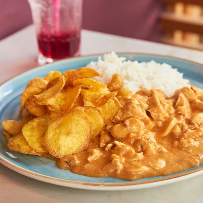 Descubra a extraordinária experiência do nosso Strogonoff de Frango. Esta delícia é meticulosamente preparada com suculentos pedaços de filé de frango, envoltos em um molho cremoso e absolutamente irresistível. Tradicionalmente servido com arroz branco, perfeitamente solto e uma porção generosa de batata, (podendo escolher entre Batata Rústica, Batata Palha ou Chips de Batata Baroa) que confere textura e sabor únicos ao prato. Para completar a experiência gastronômica, escolha uma bebida de nossa seleção. É o equilíbrio perfeito para uma refeição prazerosa e completa, capaz de satisfazer os paladares mais exigentes.