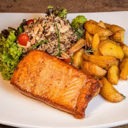 Delicie-se com nosso suculento filé de salmão grelhado, perfeito para tornar sua refeição leve e saborosa em uma experiência única. A escolha dos acompanhamentos para o seu salmão fica a seu critério, permitindo uma personalização que realça ainda mais o prazer da degustação. Opte por uma autêntica massa italiana, uma refrescante salada de folhas verdes ou quinoa, ou ainda pelo tradicional arroz branco, leve e soltinho. Nosso grelhado de salmão é ideal para um almoço balanceado, porém, recheado de sabor e qualidade. Não deixe de experimentar!