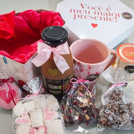 Presente a pronta entrega com várias delícias para quem é apaixonado por chocolate, e café! O kit inclui: • Chocolatinhos em forma de coração • Trufas rústicas de puro chocolate meio amargo • Marshmellows • 2 brigadeiros de café • Chocoffee Garrafa 300ml • Caneca • Papel seda • Flores secas • Caixa em formato de diamante " Você é o Meu Maior Presente" • Finalização com laço e recado especial do cliente.