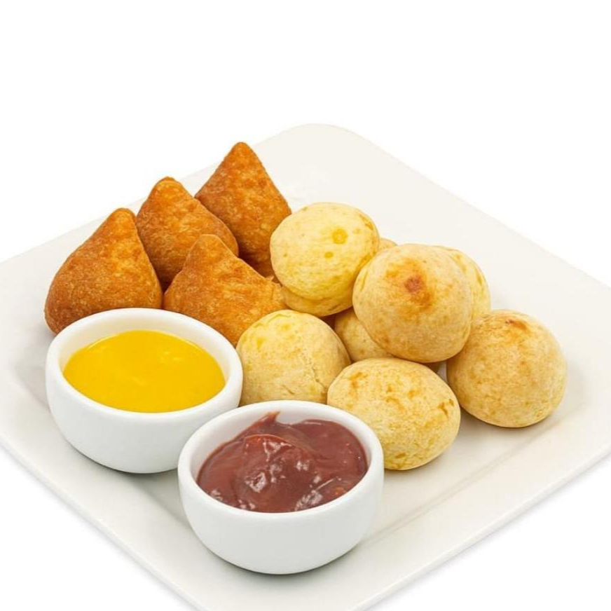 Porção de 6 pães de queijo e 4 mini coxinhas, acompanha 2 molhos sendo barbecue com goiabada e mostarda e mel.
