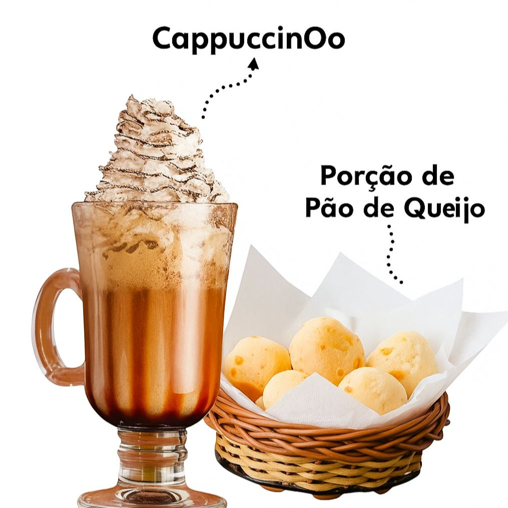 Deliciosa porção de pão de queijo 6 unidades + 1 cappuccino da sua escolha.