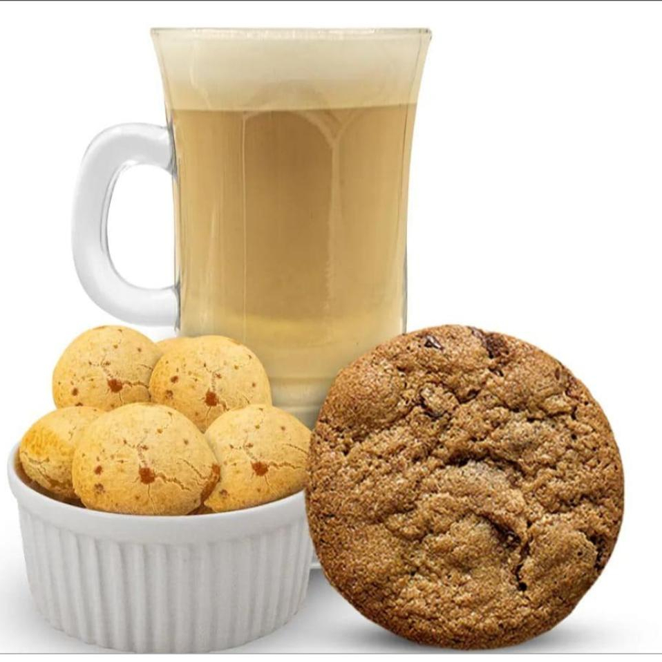 1 Porção de pão de queijo + café com leite 240ml + cookie.