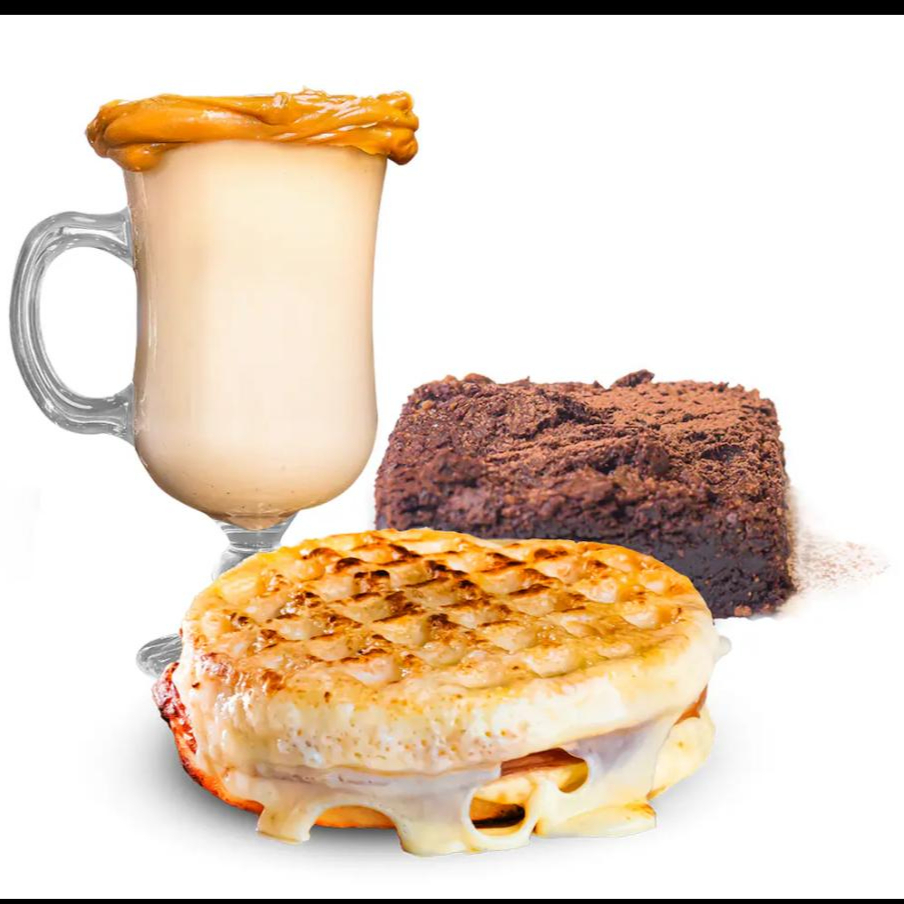 1 Waffle do chef, cappuccino 240ml e 1 brownie chocolate.