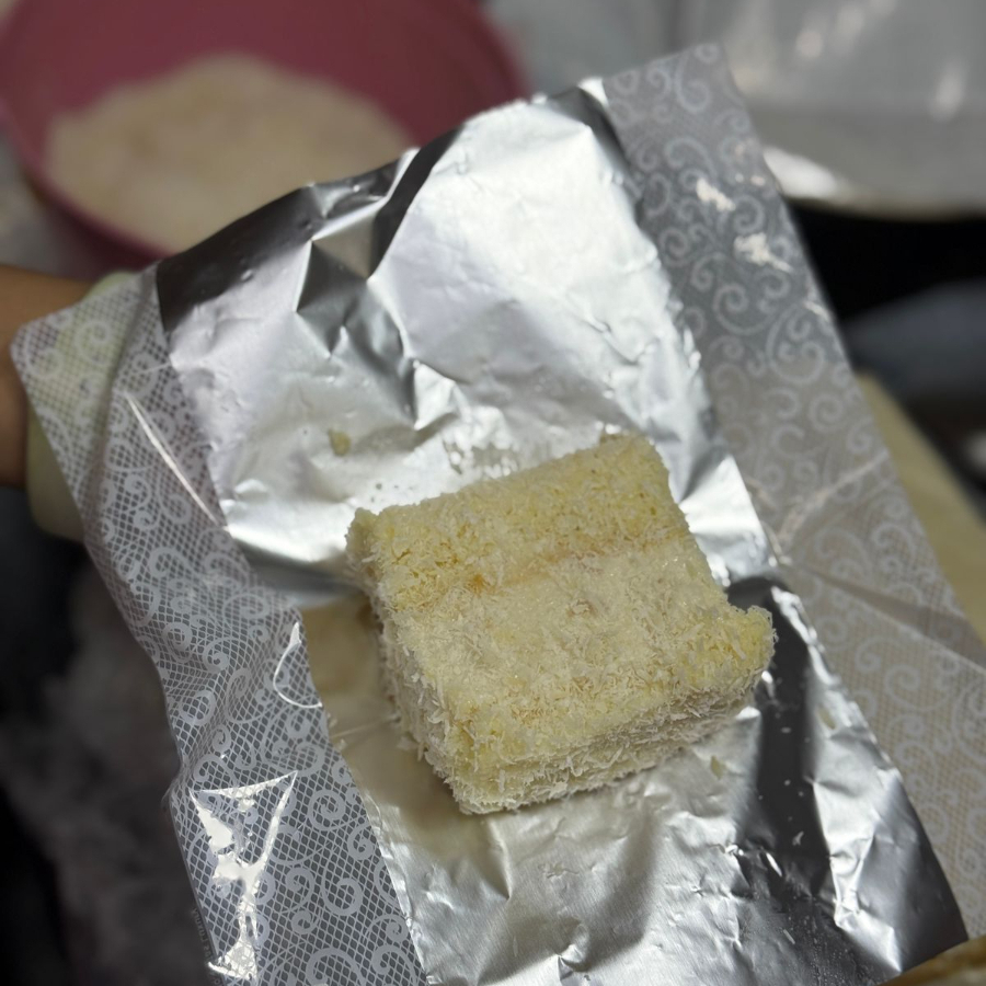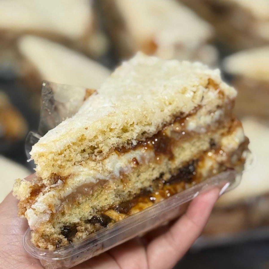 Massa branca bem molhadinho com recheio de coco, doce de leite e ameixa