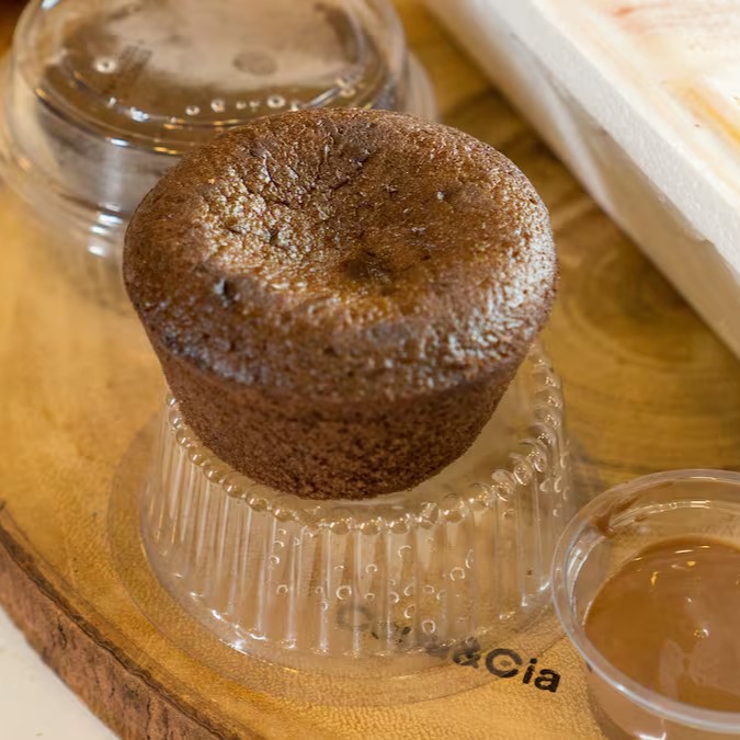 Embalagem de 700ml de sorvete e 2 petit gateau com calda de brigadeiro belga