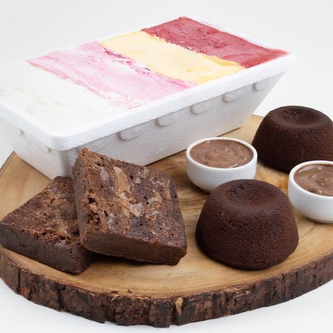 Embalagem de 1,3l de sorvete, 2 petit gateau + calda, 2 brownies + calda e 4 casquinhas
