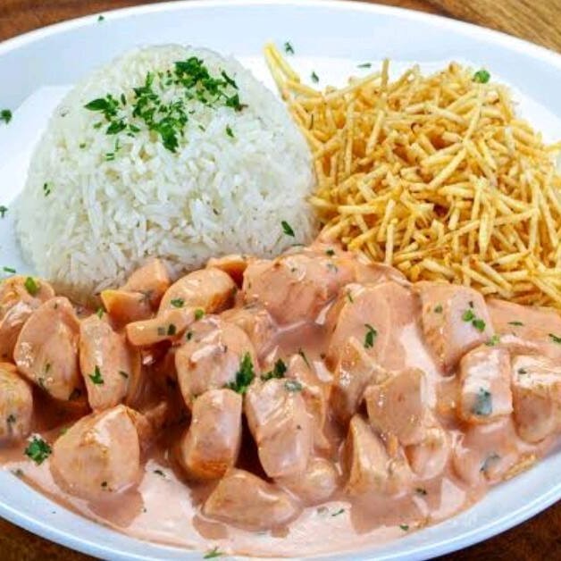 Clássico strogonoff de frango com molho cremoso de creme de leite , servido com arroz