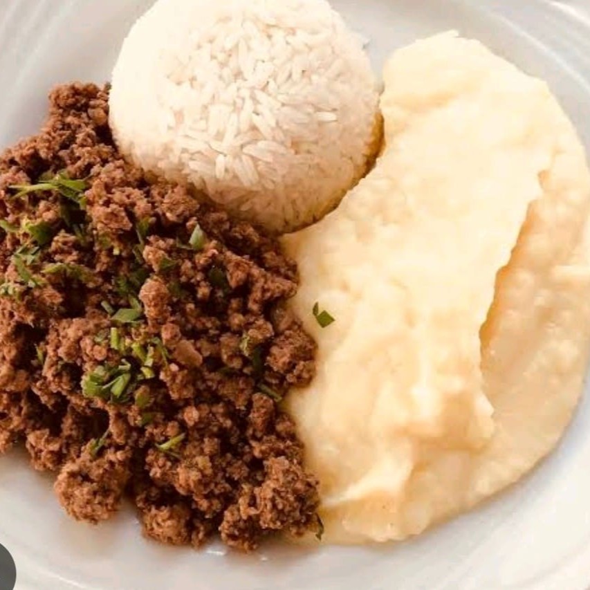 Carne moída acompanhada de purê de batatas cremoso e uma salada fresca.