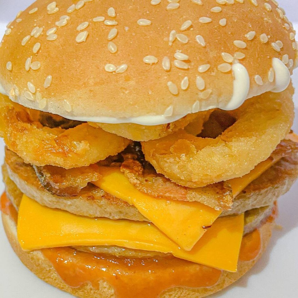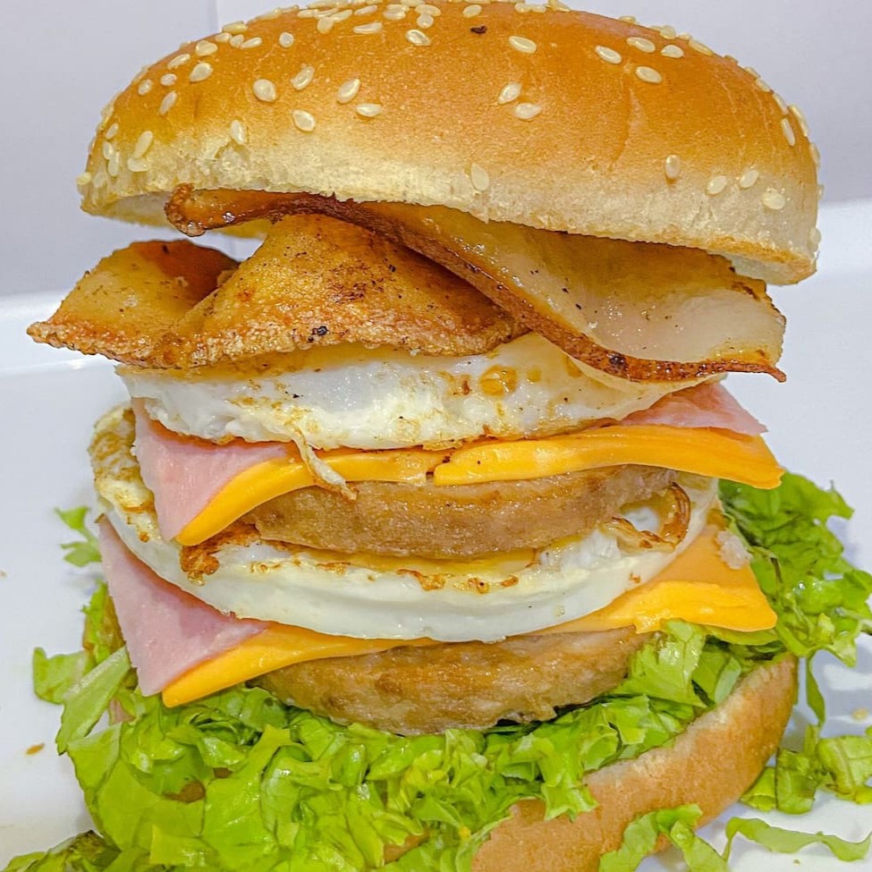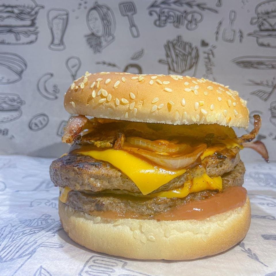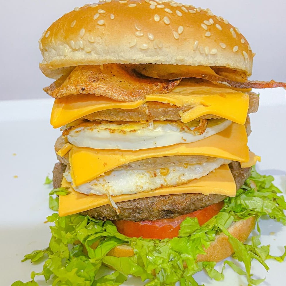 2 hamburgues de picanha, 2 fatias queijos cheddar, bacon, cebola grelhada com barbecue, molho katchup.