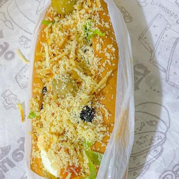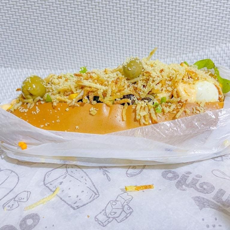 Salsicha, alface, milho, ervilha, azeitona, passas, ovo de codorna, batata palha, queijo ralado e molhos