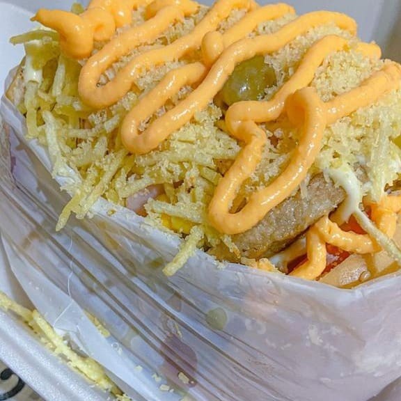 Pão, 1carne, 1ovo, queijo mussarela, presunto, bacon calabresa, cheddar cremoso, alface, tomate, cebola, milho, ervilha, passas, batata palha, ovo codorna, queijo ralado e azeitona