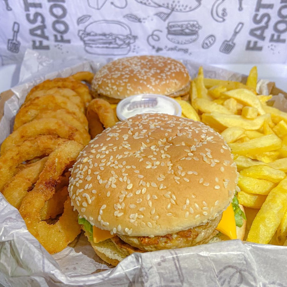2 Hambúrguers Duplo Burguer, 5 unidades de anéis de cebola, 5 unidades de nuggets, 200g de batata e 1 copinho de molho alho. OBS: A FOTO DA CAIXA SERÁ ATUALIZADA EM BREVE MOSTRANDO QUE A CAIXA IRÁ 5 UNI. DE NUGGETS E 5 UNI. DE ANÉIS DE CEBOLA.