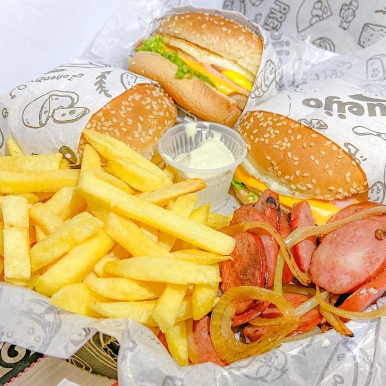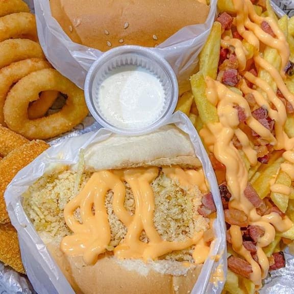 2 Hambúrguer Duplo Burguer, 5 unidades de anéis de cebola, 5 unidades nuggets, 200g de batata recheada (bacon, calabresa e cheddar) e 1 copinho de molho de alho.