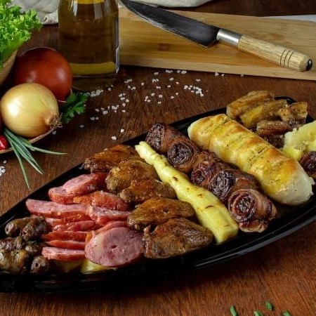 Nossa Barca De Churrasco Casal Acompanha: Coração, Carne, Coxinha Da Asa, Linguiça Toscana Suína E Frango , Salsichão, Com Nosso Delicioso Pão De Alho + Farofa E Molho À Campanha Com Arroz, Feijão ( ou baião de dois opcional ), Maionese E Batata Frita + Refri De 1,5l Coca Cola;