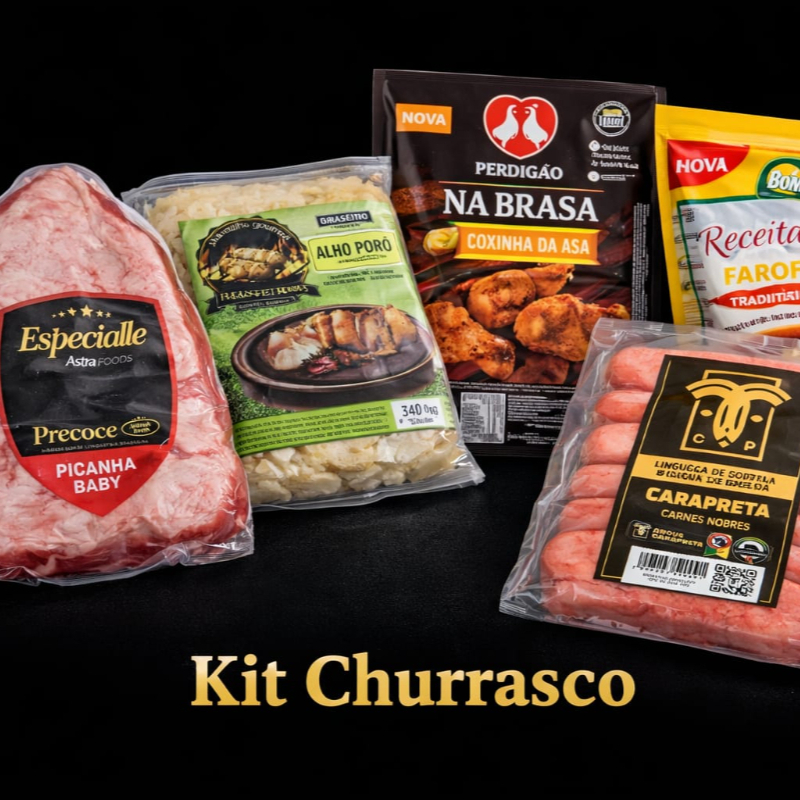 picanha baby top + linguiça de costela carapreta + coxinha da asa + pão de alho bandeja com 6 pães + farofa