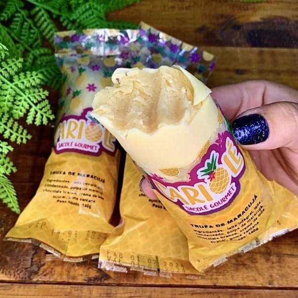 Você precisa experimentar nosso Sacolé Trufa de Maracujá! É uma explosão de sabor, com mousse de maracujá super cremoso, feito com polpa 100% natural, e uma casquinha de chocolate branco que simplesmente derrete na boca. E o melhor de tudo, é feito com chocolate top de linha, sem tipo de corantes ou saborizantes artificiais! É só sabor puro e natural em cada mordida! Ah, e sabe o que mais? Cada um