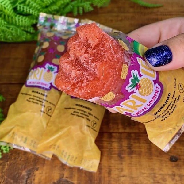 100% fruta, 100% natural! É tipo uma explosão de verão no saquinho, feita só com suco de limão fresquinho, morangos suculentos, água cristalina e só um pouquinho de açúcar pra ficar doce na medida. Cada mordida é uma festa de sabores, com 130g de pura alegria em cada sacolé. E olha só, sem nenhum corante ou sabor artificial, é tudo natureba do começo ao fim!