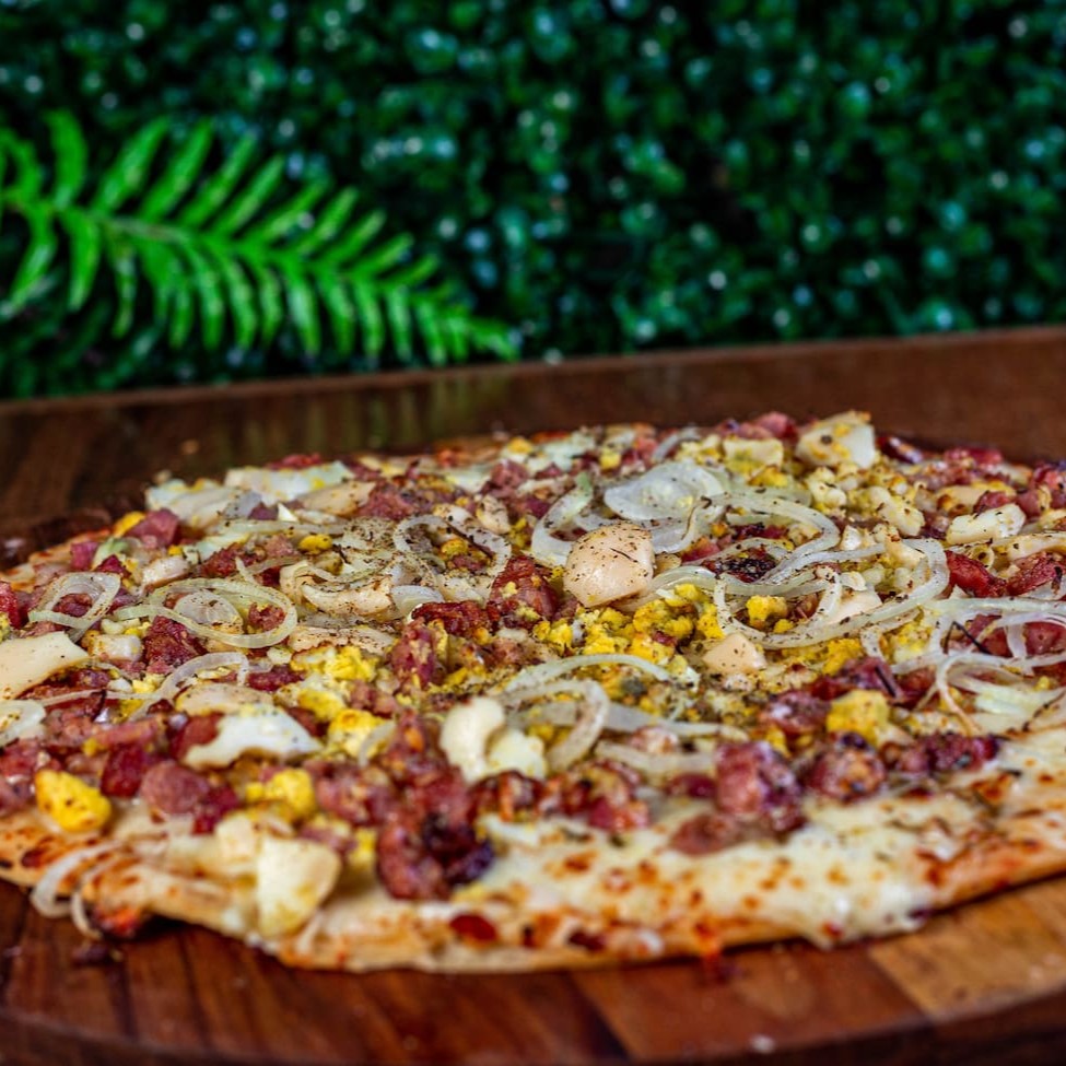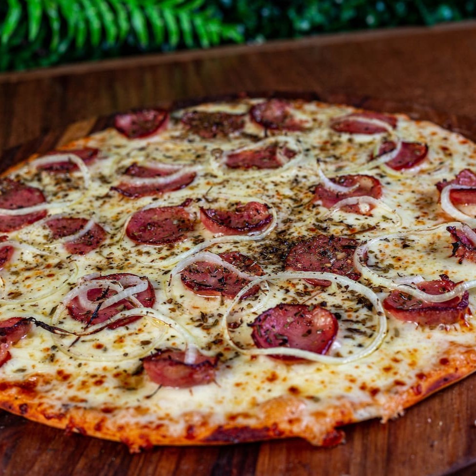 Molho caseiro, deliciosa muçarela derretida coberta por fatias de calabresa e cebola e o melhor, no precinhoo