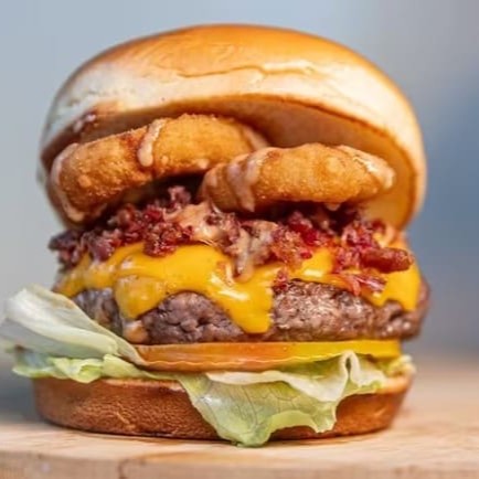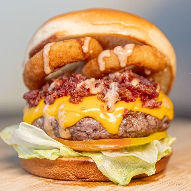 150g de fraldinha, queijo cheddar, anel de cebola, bacon, alface americana, tomate e molho defumado..