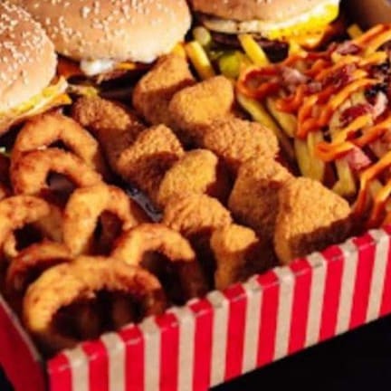 3 cartoon bacon, batata com cheddar e bacon, nuggets e anel de cebola