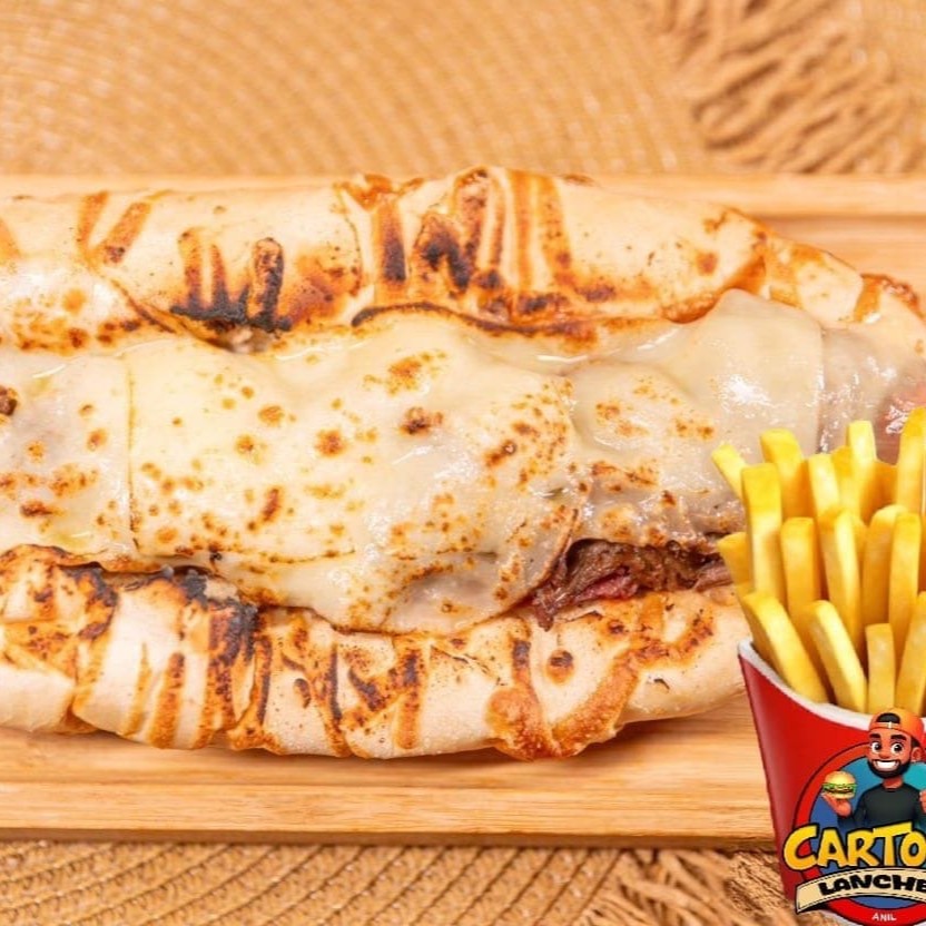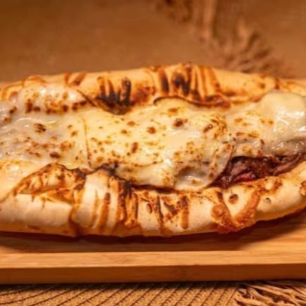 150 g de fraldinha, queijo muçarela, carne assada desfiada, rúcula e cebola roxa, maionese temperada.