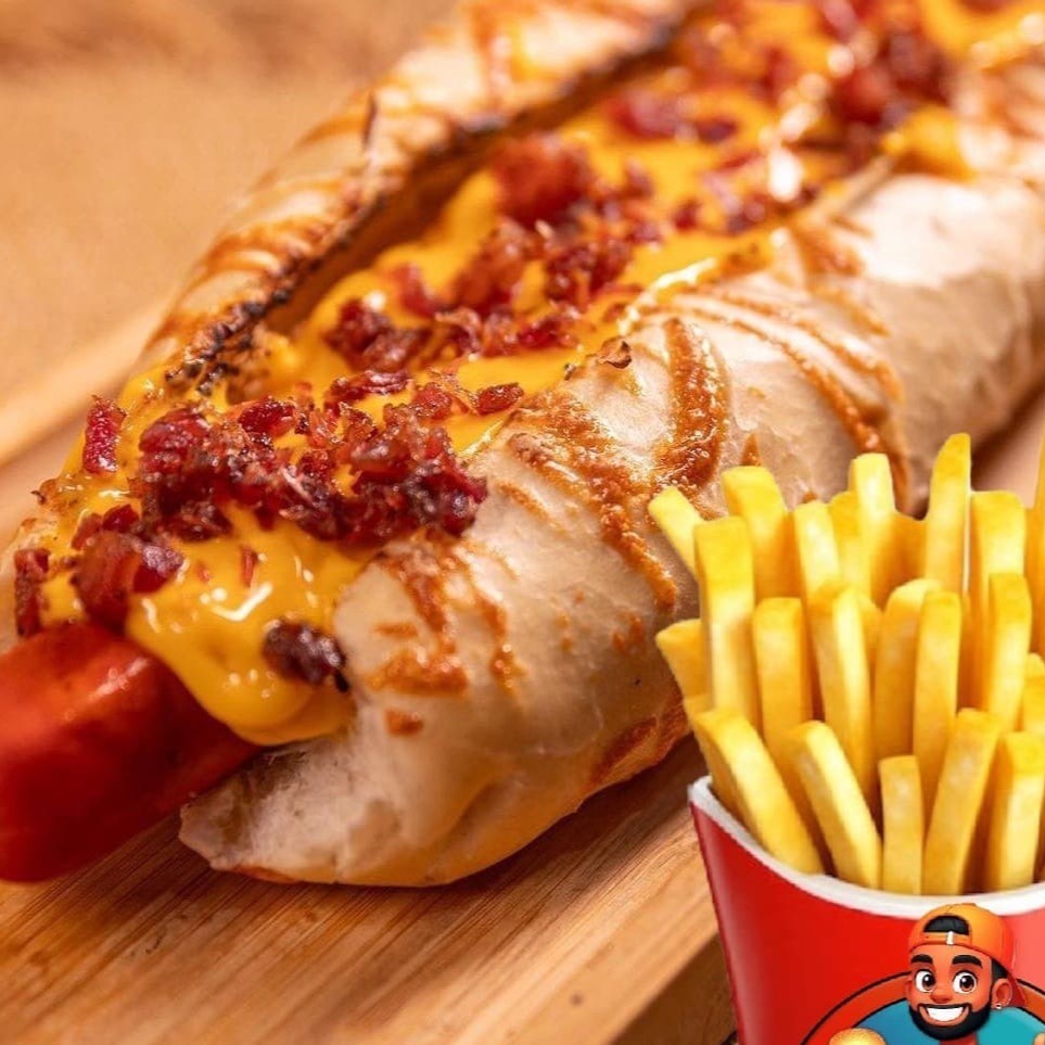 Delicioso combo cachorro quente de salsicha ou linguiça , cebola grelhada no molho shoyu, tomate ,cheddar cremoso , farofa de bacon na baquete de provolone + batata frita + refrigerante lata