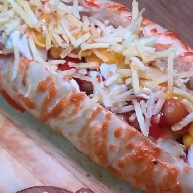 Delicioso cachorro quente de salsicha ou linguiça , carne desfiada, queijo mussarela , cebola roxa picada , mioness defumada na baquete de provolone