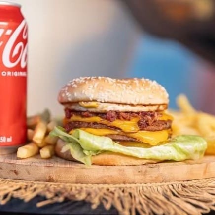 Hambúrguer Coyote, batata frita e refrigerante lata. Refrigerante Coca Cola ou Guaraná.