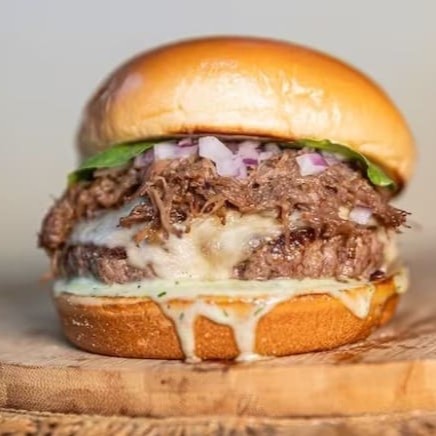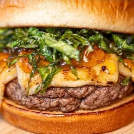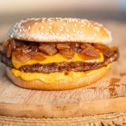 Hambúrguer de picanha , queijo cheddar cremoso e cebola no shoyo.
