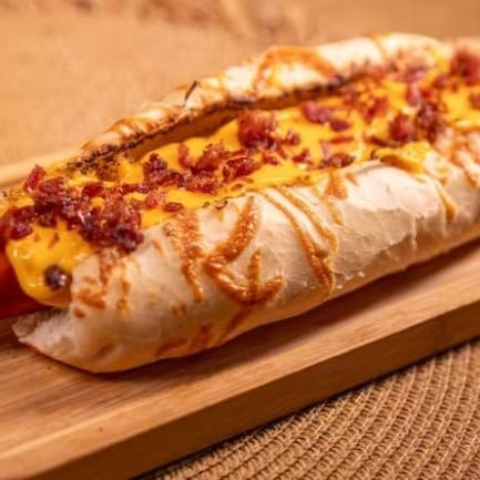 Salsicha ou linguiça , cebola grelhada no molho shoyu, cheddar cremoso , farofa de bacon na baguete de provolone