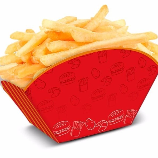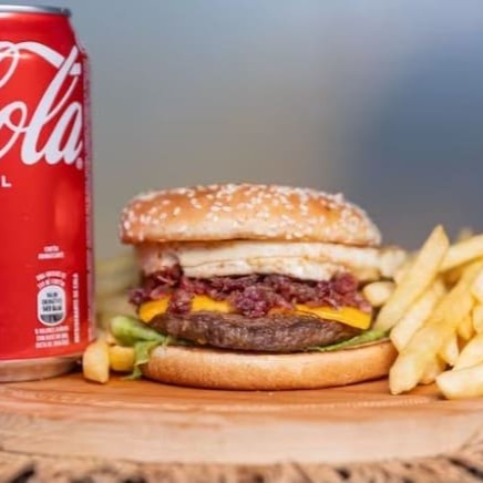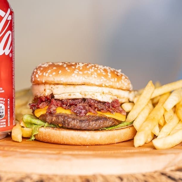 Hambúrguer Frajola, batata frita e refrigerante lata. Refrigerante Coca Cola ou Guaraná.