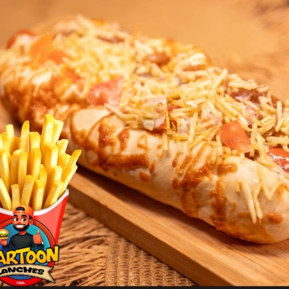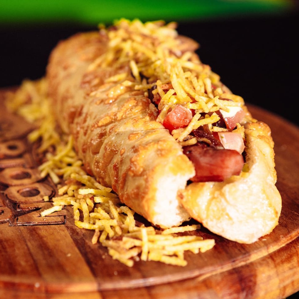 (salsicha ou linguiça grelhada, milho, ervilha, ketchup, mostarda, maionese, molho de tomate e batata palha na baguete de provolone)