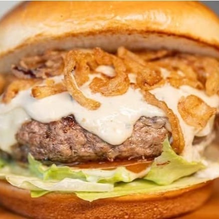 150 de fraldinha, queijo muçarela, gorgonzola, cebola crispy, alface americana, tomate e molho especial.