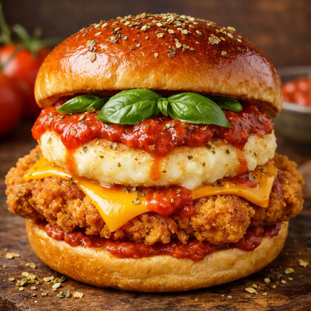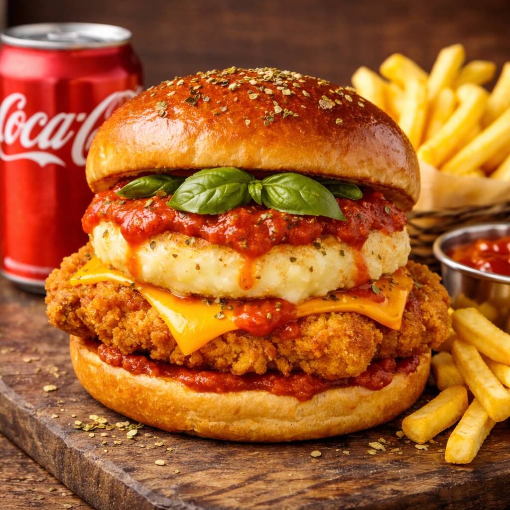 Hambúrguer de frango empanado, queijo cheddar,mussarela empanada , molho de tomate ,mangericao ,orégano no pão brioche .
