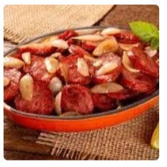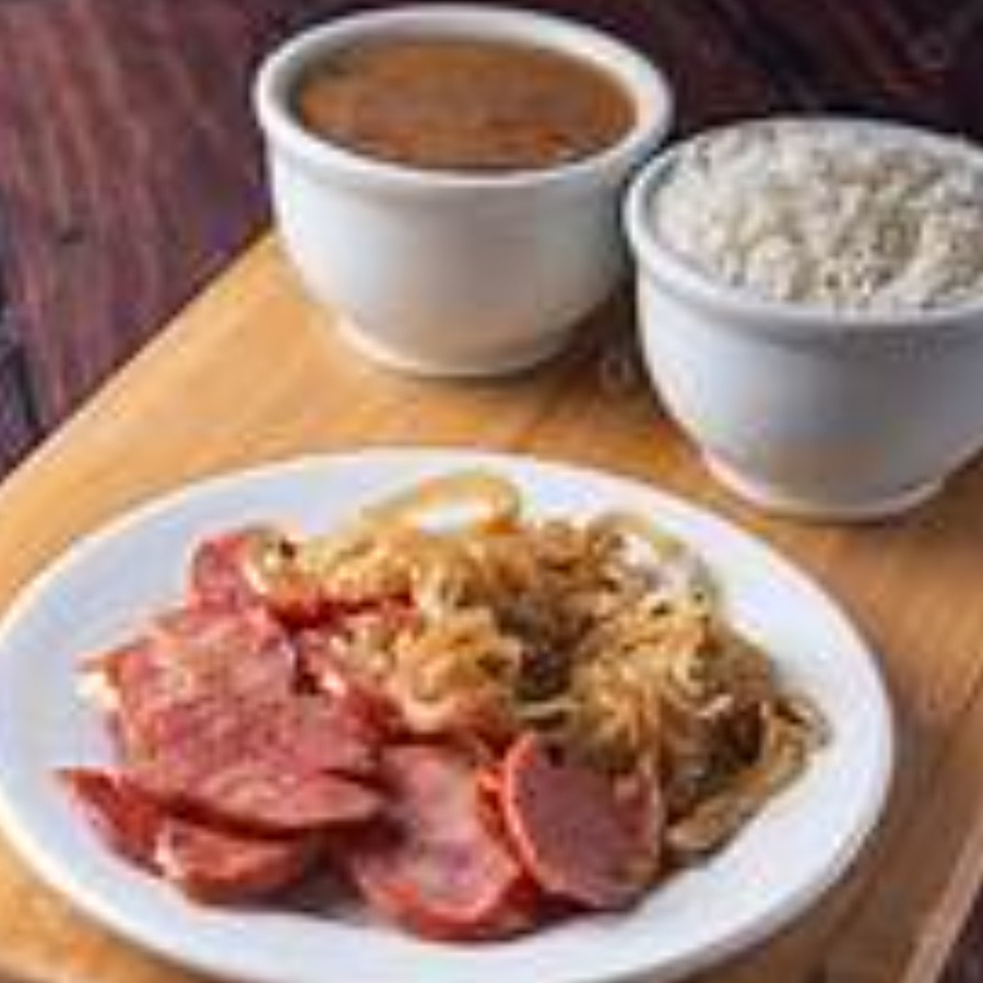 Linguiça Calabresa Acebolada + Arroz + Feijão + Macarrão + um acompanhamento a sua escolha